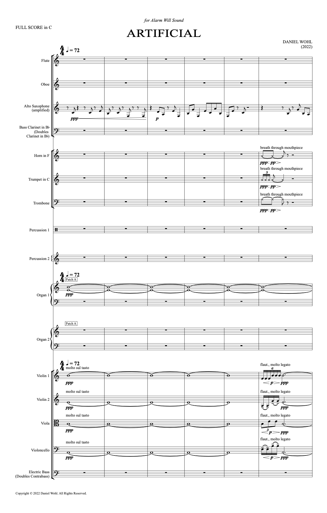 Artificial is a piece that can be experienced both as an electronic track and as an acoustic performance for chamber orchestra. Written in 2022 for Alarm Will Sound, this piece investigates how electronic sounds can be translated for a traditional ensemble and how electronic music can be convincingly realized by human performers on instruments with a long history. The transcription process and the inherent qualities of the instruments have led to changes in the original composition, creating a new and unique interpretation of the work. Artificial was commissioned by the RPM Commissioning Fund for Alarm Will Sound.